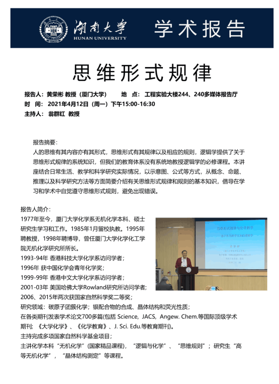 学术地点 工程实验大楼244、240多媒体报告厅 主讲人 黄荣彬 教授(厦门大学)