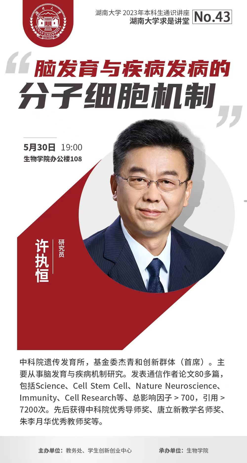 学术地点 生物学院办公楼108 主讲人 许执恒