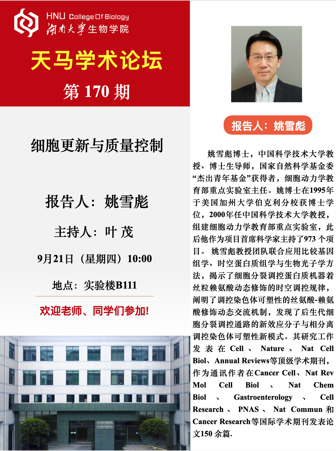 学术地点 生物学院实验楼B111 主讲人 姚雪彪