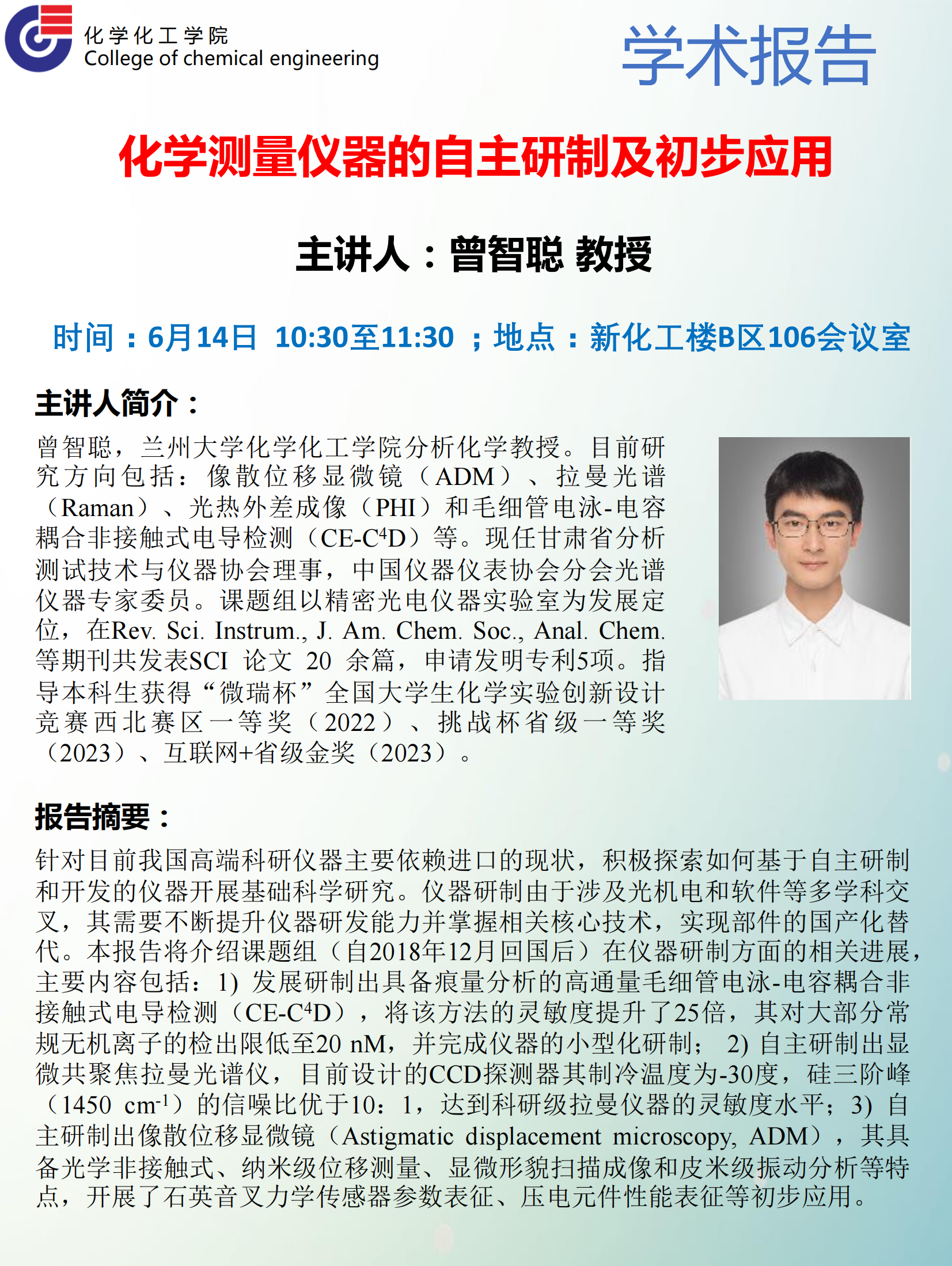 学术地点 新化工楼B区106会议室 主讲人 曾智聪