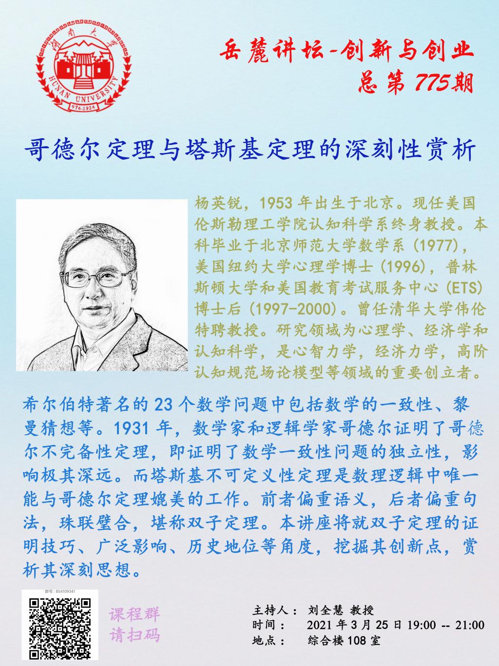 希尔伯特著名的23个数学问题中包括数学的一致性、黎曼猜想等。1931年,数学家和逻辑学家哥德尔证明了哥德尔不完备性定理,即证明了数学一致性问题的独立性,影响极其深远。而塔斯基不可定义性定理是数理逻辑中唯一能与哥德尔定理媲美的工作。前者偏重语义,后者偏重句法,珠联璧合,堪称双子定理。本讲座将就双子定理的证明技巧、广泛影响、历史地位等角度,挖掘其创新点,赏析其深刻思想。