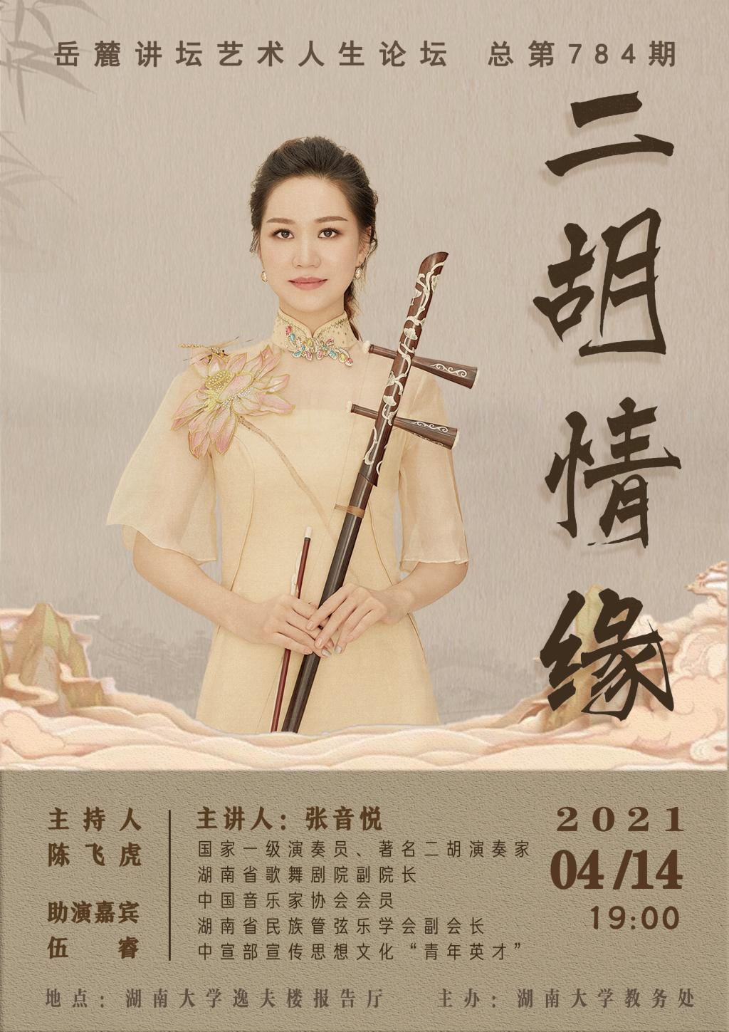 主讲人:张音悦(国家一级演员,著名二胡演奏家,湖南省歌舞剧院副院长,中国音乐家协会会员,湖南省民族管弦乐学会副会长,中宣部宣传思想文化“青年英才”)