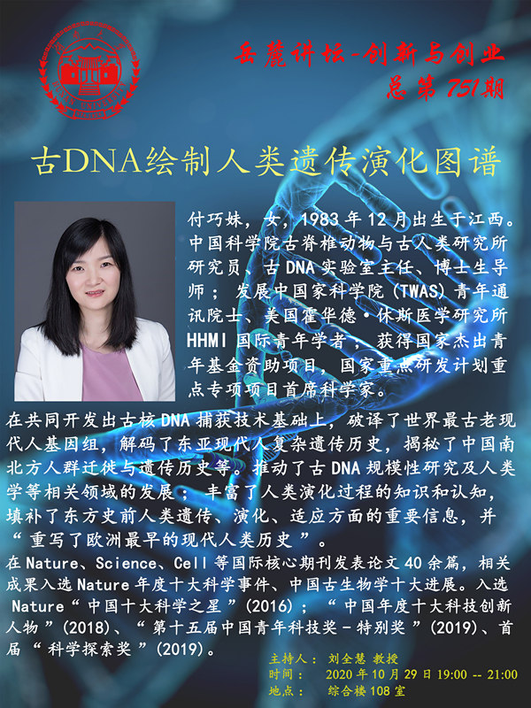 付巧妹,女,1983年12月出生于江西。中国科学院古脊椎动物与古人类研究所研究员、古DNA实验室主任、博士生导师;发展中国家科学院(TWAS)青年通讯院士、美国霍华德•休斯医学研究所HHMI国际青年学者;获得国家杰出青年基金资助项目,国家重点研发计划重点专项项目首席科学家。在Nature、Science、Cell等国际核心期刊发表论文40余篇,相关成果入选Nature年度十大科学事件、中国古生物学十大进展。入选 Nature“中国十大科学之星”(2016);“中国年度十大科技创新人物”(2018)、“第十五届中国青年科技奖-特别奖”(2019)、首届“科学探索奖”(2019)。