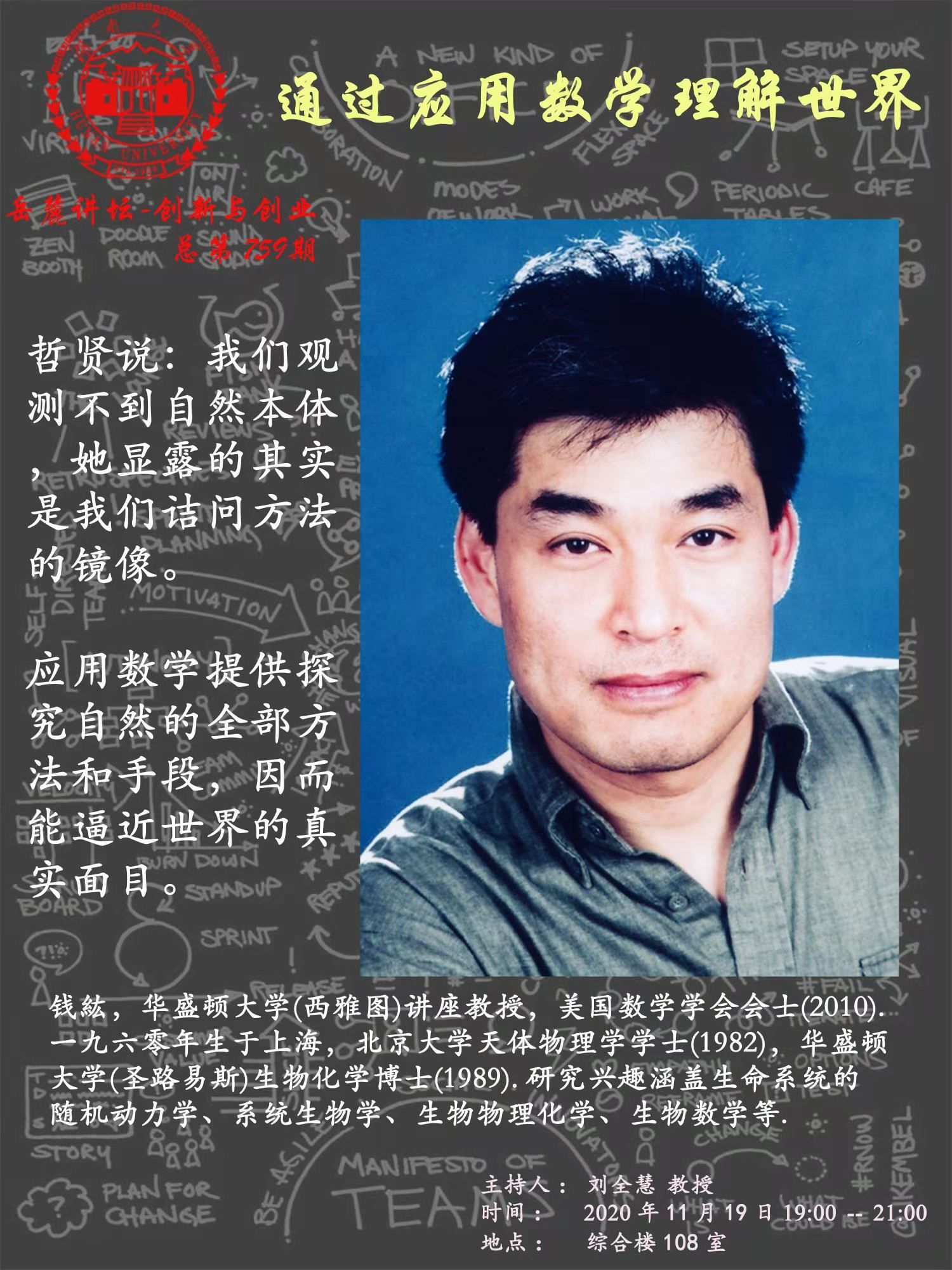 钱紘,华盛顿大学(西雅图)讲座教授,美国数学学会会士(2010). 一九六零年生于上海,北京大学天体物理学学士(1982),华盛顿大学(圣路易斯)生物化学博士(1989). 研究兴趣涵盖生命系统的随机动力学、系统生物学、生物物理化学、生物数学等.