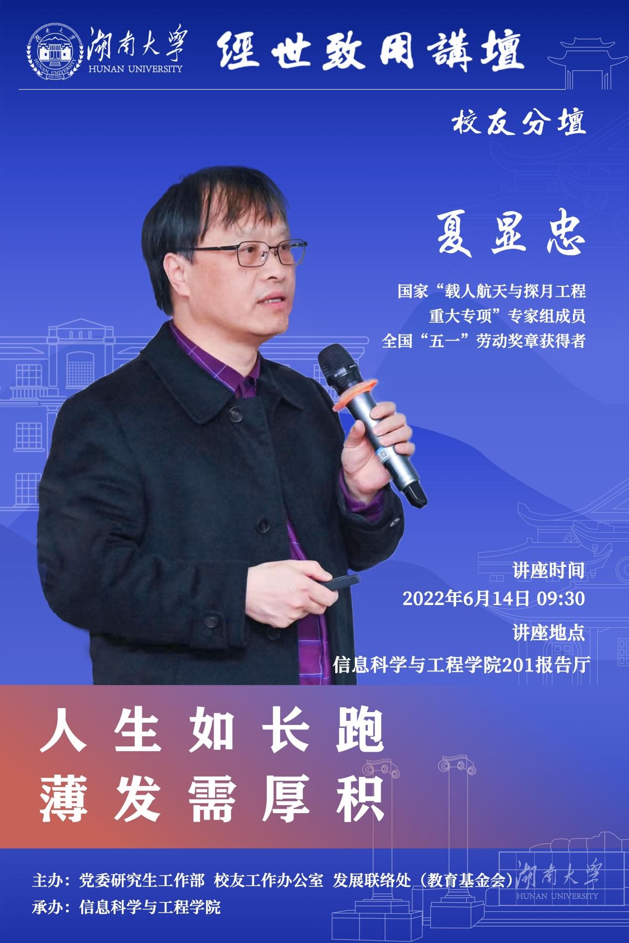 6月14日9:30邀请全国“五一”劳动奖章获得者、国家“载人航天与探月工程重大专项”专家组成员夏显忠校友于信息科学与工程学院201报告厅作“人生如长跑、薄发需厚积”主题报告,欢迎同学们前来听讲。