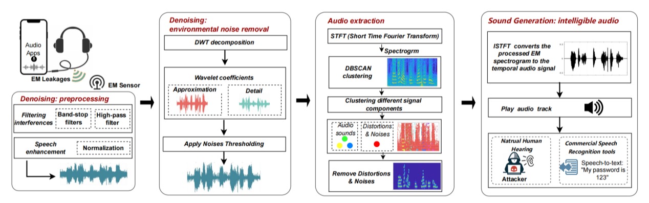 2023/07/04胡玉鹏、靳文强教授团队在移动设备语音泄漏研究中取得进展近日,胡玉鹏教授、靳文强教授团队在移动设备系统安全研究领域取得突破进展,首次发现了移动设备音频电路放大器的低频电磁辐射所导致的用户语音信息泄漏问题。通常,移动设备端音频电路产生的音频信号可通过有线... -