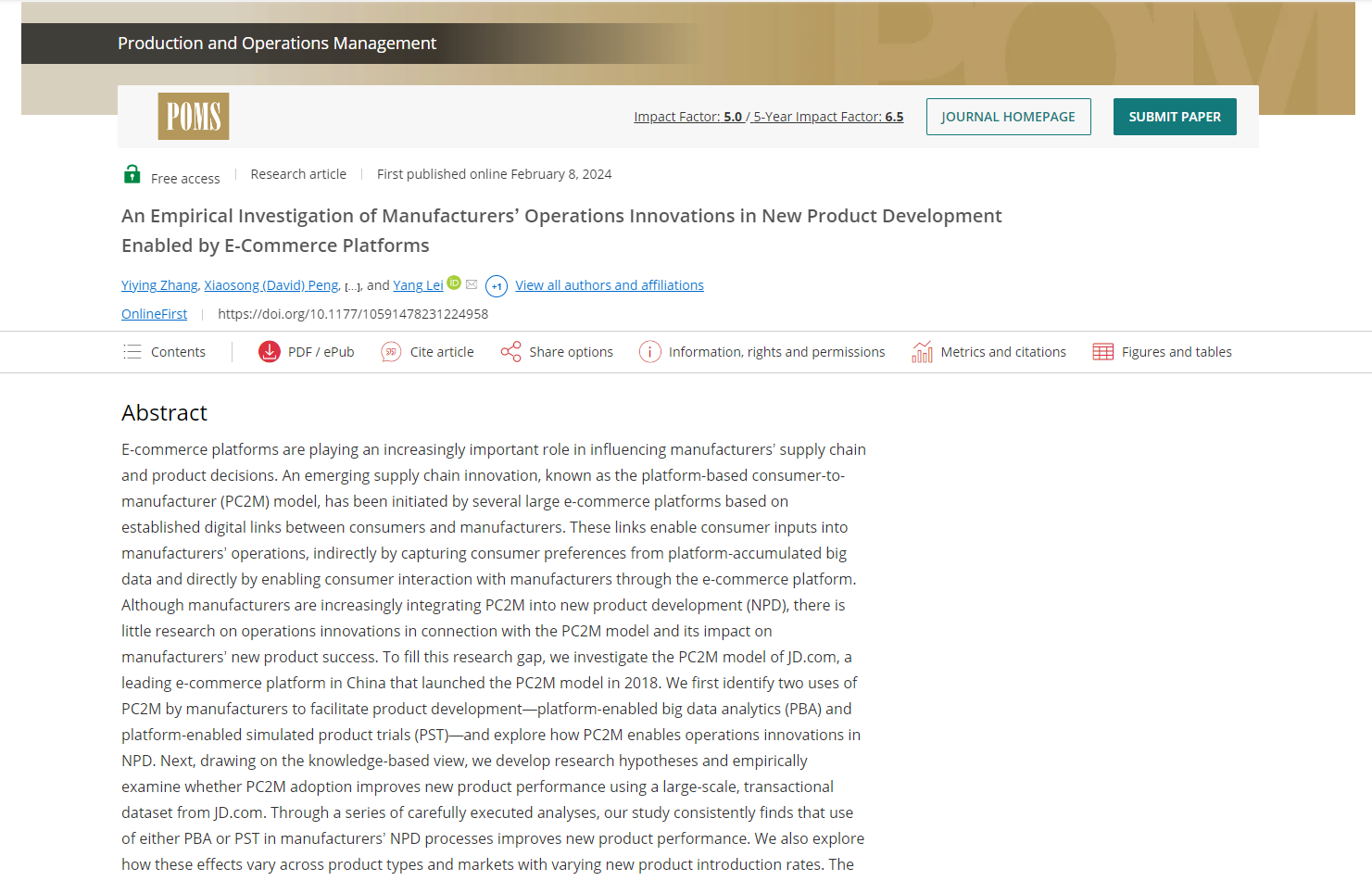 2024/02/23工管院张逸颖研究成果在国际管理学顶刊发表近日,工商管理学院信息管理与电子商务系助理教授张逸颖在供应链管理领域研究取得新突破,研究成果以“An Empirical Investigation of Manufacturers’ Operations Innovations in New Product Development Enabl... -