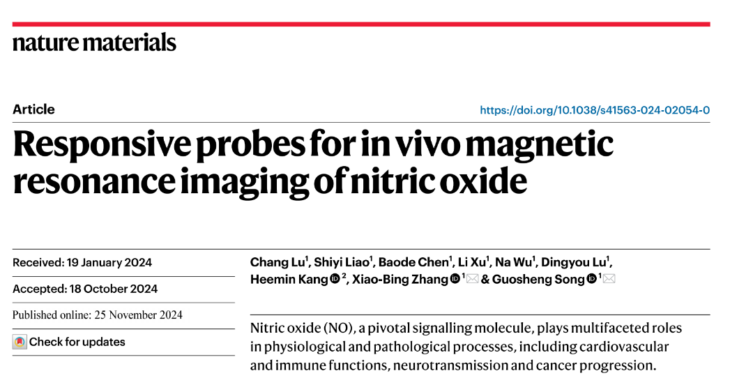 2024/11/27化工院宋国胜教授和张晓兵教授在磁共振分子影像研究中取得重要突破一氧化氮(NO)是人体中重要的信号分子,参与调节血流、维持细胞活力及保护心肌和神经细胞等多种生理过程。NO 信号异常与心脑血管疾病、神经退行性疾病、肝炎、糖尿病和癌症等密切相关。研究表明,NO 的生物学效... -