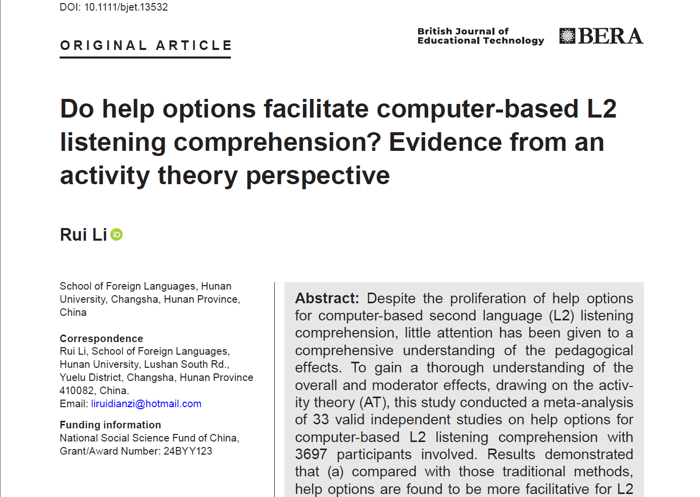 2024/11/13外国语学院李锐教授研究成果在教育学顶级期刊发表近日,外国语学院李锐教授在外语教育学研究领域中取得新进展。该研究以“Do help options facilitate computer-based L2 listening comprehension? Evidence from an activity theory perspective”为题,发表于...